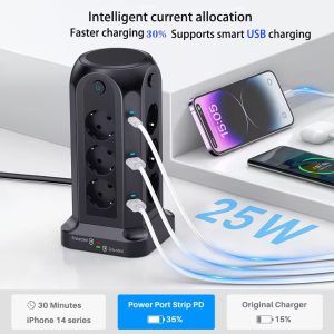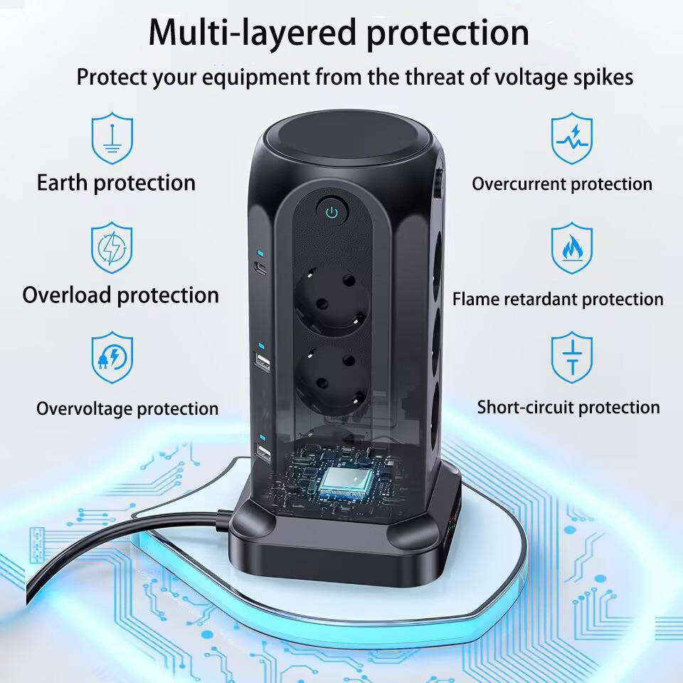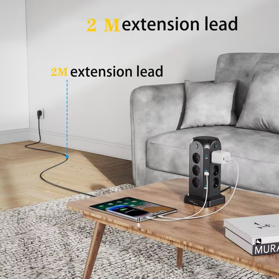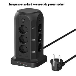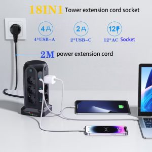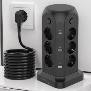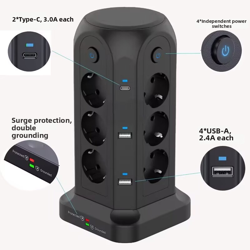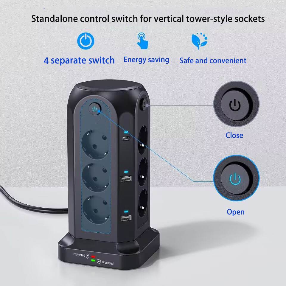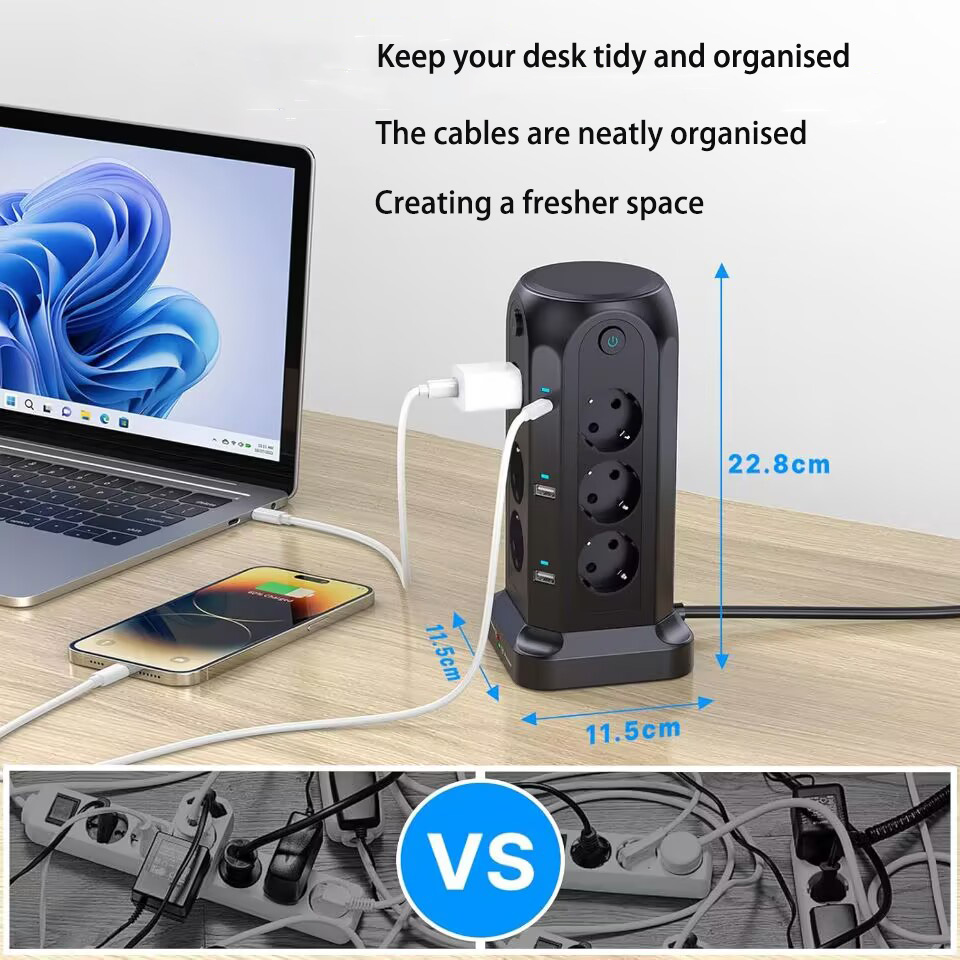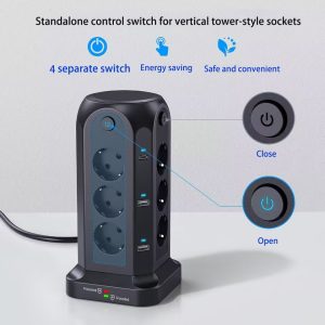 1.3250W Tower-Style Multi-Port Power Strip: This 3250W tower-style multi-port power strip features 12 Euro-style sockets and 4 USB ports, making it ideal for desktop use. With a power rating of 3250W/13A, it can support multiple devices simultaneously, reducing cable clutter and providing a convenient solution for environments with limited power sockets or USB ports, such as homes, offices, kitchens and garages.